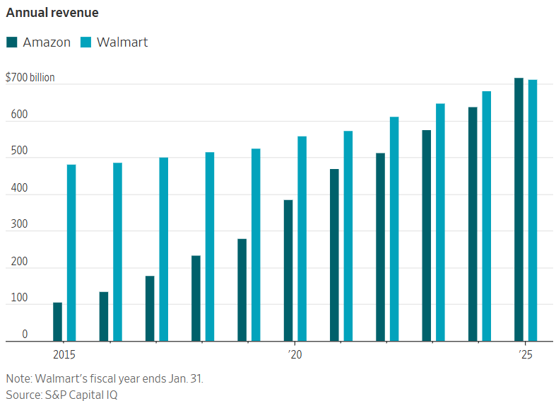 Nassauer, S., & McLain, S. (2026, February 19). Amazon Is Now America’s Biggest Company. Its 17-Year Journey to Surpass Walmart. The Wall Street Journal. https://www.wsj.com/business/retail/amazon-biggest-us-company-walmart-cfd0cac4?st=nFqXvf