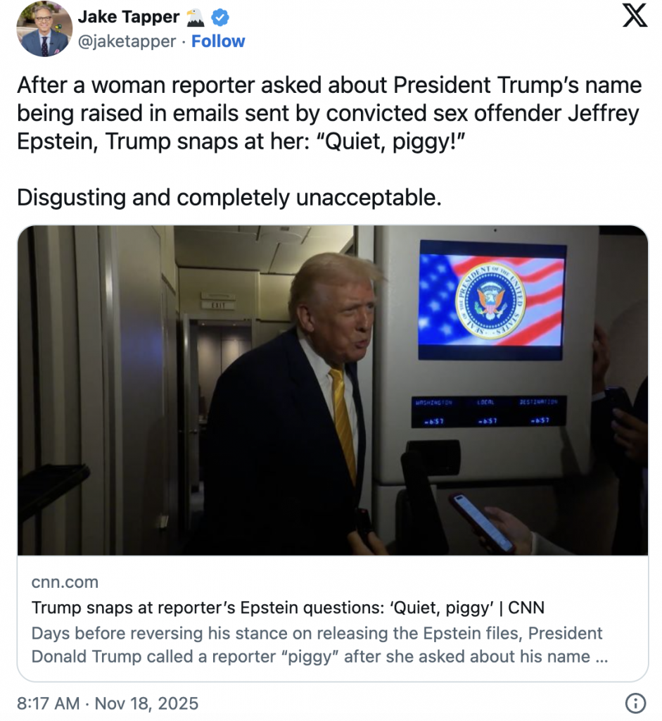 González, J. S. (2025, 18 noviembre). “¡Cállate, cerdita!”. Trump insulta a una periodista que le pregunta por los archivos de Epstein. El País. https://elpais.com/internacional/2025-11-18/callate-cerdita-trump-insulta-a-una-periodista-que-le-pregunta-por-los-archivos-de-epstein.html?event_log=go