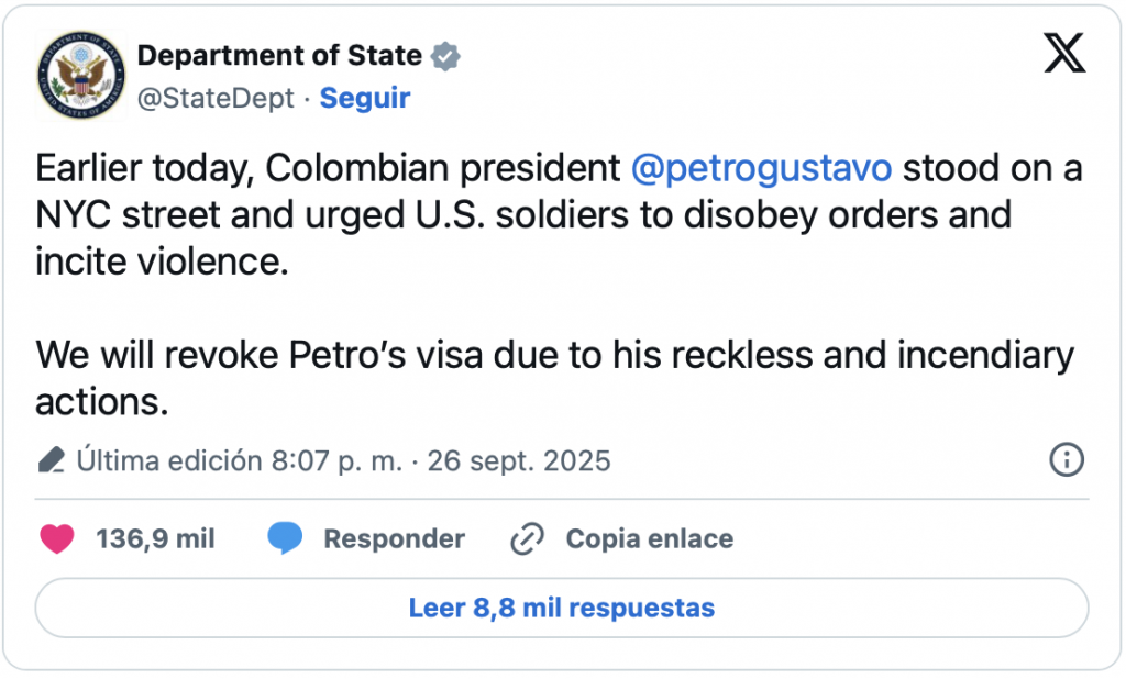 Osorio, C. (2025, September 27). Estados Unidos revoca la visa de Petro tras su protesta en favor de Palestina: “Sus acciones son imprudentes e incendiarias.” El País América Colombia. https://elpais.com/america-colombia/2025-09-27/estados-unidos-revoca-la-visa-de-petro-tras-su-protesta-en-favor-de-palestina-sus-acciones-son-imprudentes-e-incendiarias.html