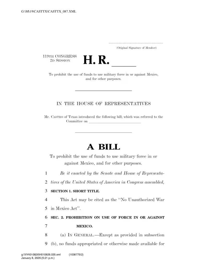 El pasado miércoles 14 de enero legisladores de Estados Unidos han propuesto una iniciativa que busque proteger el territorio de otros países con la acción de “Ley de no a una guerra no autorizada en México” impulsada por Joaquin Castro, así como de Sara Jacobs y Greg Stanton