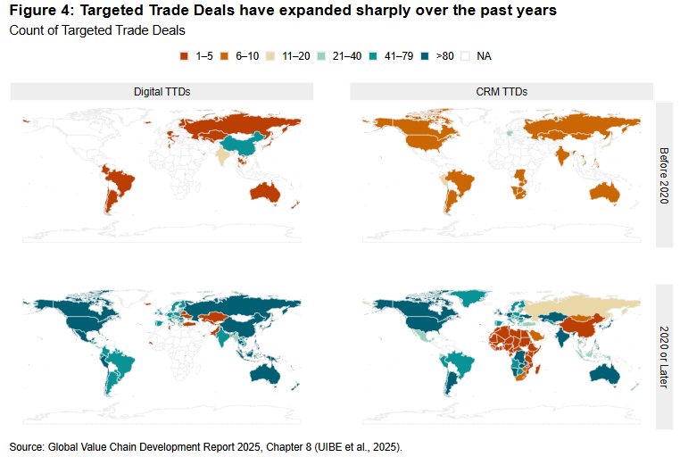 Another structural development is the rapid expansion of targeted trade deals (TTDs). By 2024, more than 185 TTDs had been signed in digital trade and critical minerals alone. Digital TTD links expanded more than thirtyfold between 2019 and 2024, and 80% of mineral deals were concluded after 2022 (see Figure 4).