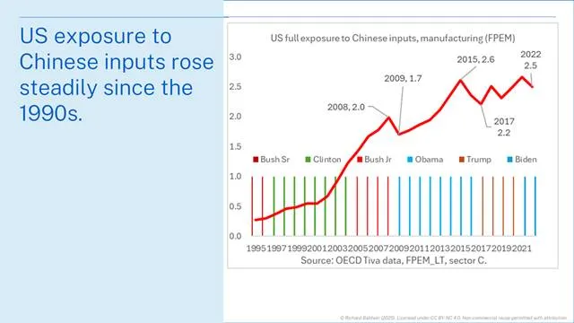 While the percentages are small relative to total U.S. input use, the trend remains unmistakable. Chinese exposure grew for decades and shows no sign of falling, even as domestic subsidies (CHIPS, IRA) and new tariff waves attempt to shift the balance.