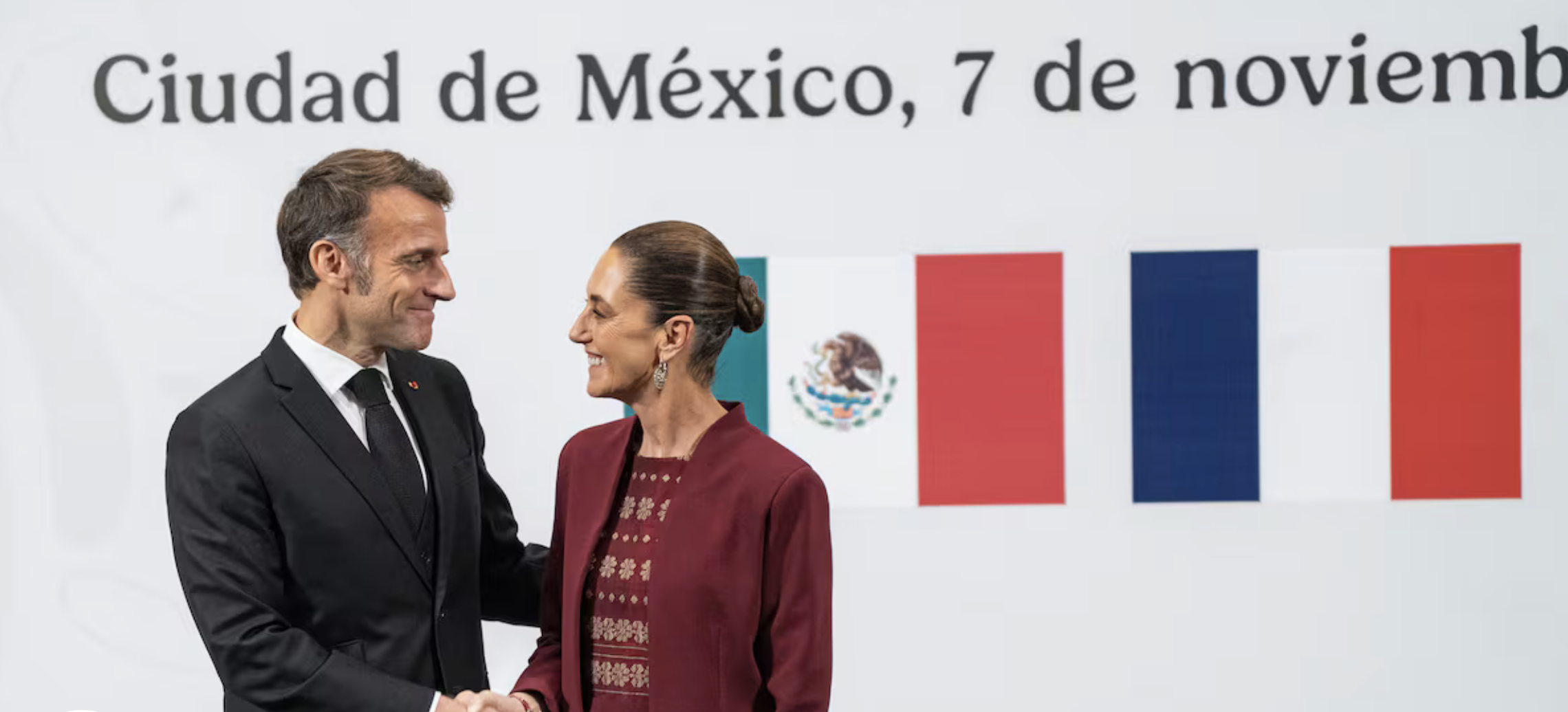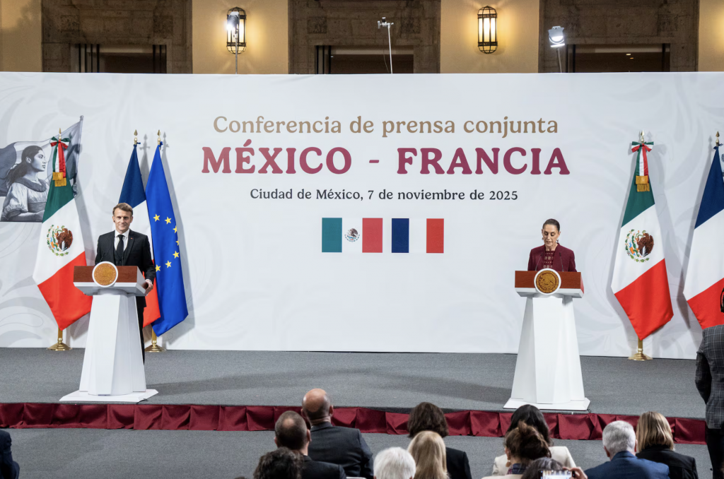 Macron y Sheinbaum en conferencia de prensa en Palacio Nacional. Fuente: El País