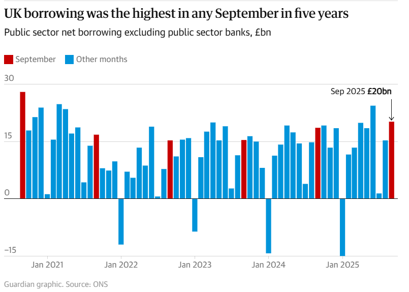 Inman, P. (2025, October 22). UK borrowing reaches five-year high for September at £20.2bn. The Guardian. https://www.theguardian.com/business/2025/oct/21/uk-borrowing-high-september-debt-public-finances-rachel-reeves