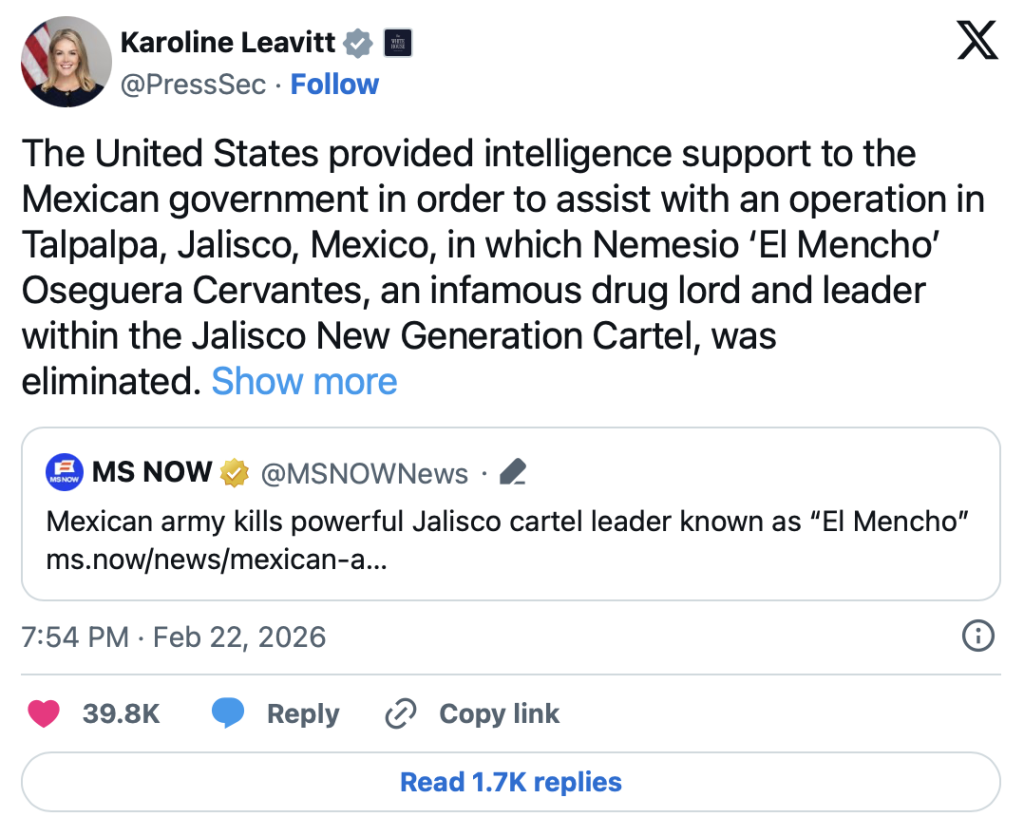 Mexican President Claudia Sheinbaum confirmed that the operation was carried out by federal forces, while the White House stated that US intelligence support played a role. Analysts note that bilateral security cooperation in high-profile cartel cases is not new, but the scale of violence following El Mencho’s death highlights the risks inherent in targeting cartel leadership. The CJNG has a history of direct confrontation with the state, including shooting down a military helicopter in 2015 and attempting to assassinate senior officials.