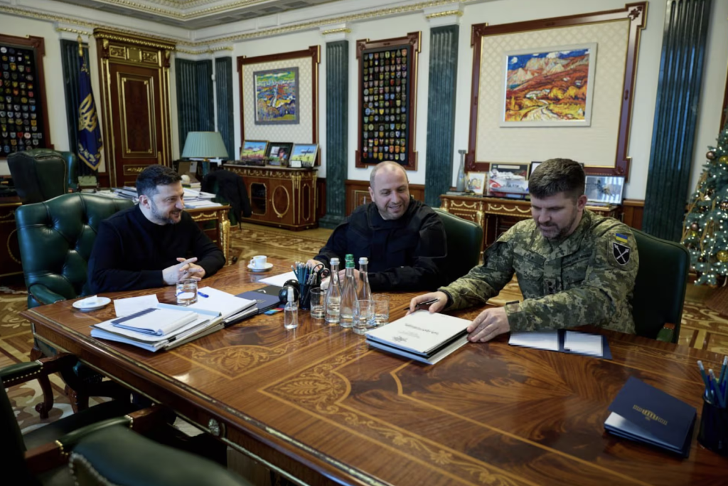 Volodímir Zelenski, este martes en Kiev con el secretario del Consejo de Seguridad Nacional y de Defensa de Ucrania, Rustem Umérov (centro), y el jefe del Estado Mayor ucranio, Andrii Gnátov.